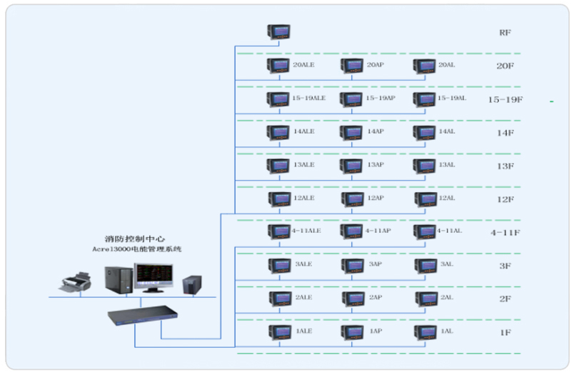 我司本項(xiàng)目承接其樓層部分電能管理系統(tǒng)搭建,完成對(duì)配電回路用電的實(shí)時(shí)監(jiān)控和管理。該項(xiàng)目進(jìn)出線回路均采用ACR多功能液晶顯示儀表,其是針對(duì)電力系統(tǒng)、公共設(shè)施、智能大廈的電力監(jiān)控需求而設(shè)計(jì)的網(wǎng)絡(luò)電力儀表,它能測(cè)量所有常規(guī)電力參數(shù),如:三相電壓、電流、有功功率、無功功率、功率因數(shù)、頻率、有功電度、無功電度?,F(xiàn)場(chǎng)儀表以手拉手方式通過屏蔽雙絞線(RVVSP2*1.0)進(jìn)行通訊連接,每根總線連接智能儀表數(shù)量在20只左右,不同種類的智能裝置連接在不同的總線上,然后將數(shù)據(jù)上傳至數(shù)據(jù)采集器,進(jìn)而將數(shù)據(jù)上傳至當(dāng)?shù)乇O(jiān)控終端。
