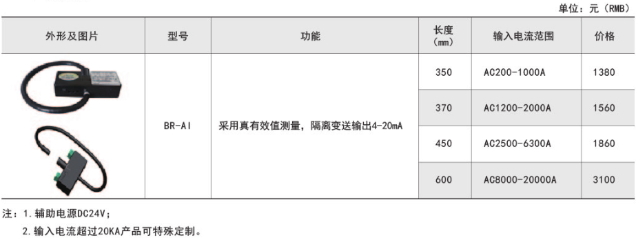 BR系列產品應用電磁感應原理,對電網中的交流大電流進行實時測量,采用真有效值和線性補償技術,將其隔離變換為標準的直流信號輸出。適用于冶金、電鍍、焊接等領域。具體型號:BR-AI技術要求:輸入電流AC1...
